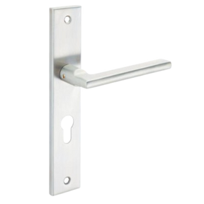 Modern Brushed Stainless Steel lever handle on plate with cylinder key hole