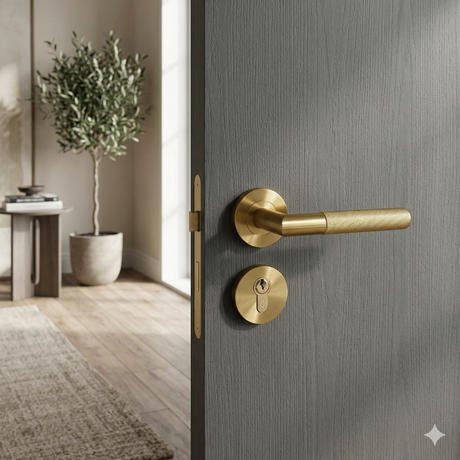 R 46900R 55000Unit priceModern Matt Brass Door Handle on Rose with Two Lever Mortice Lock