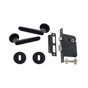 Modern Matt Black Door Handle on Round Rose with Two Lever Mortice Lock