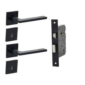 Modern Matt Black Door Handle on Square Rose with Two Lever Mortic Lock in Black